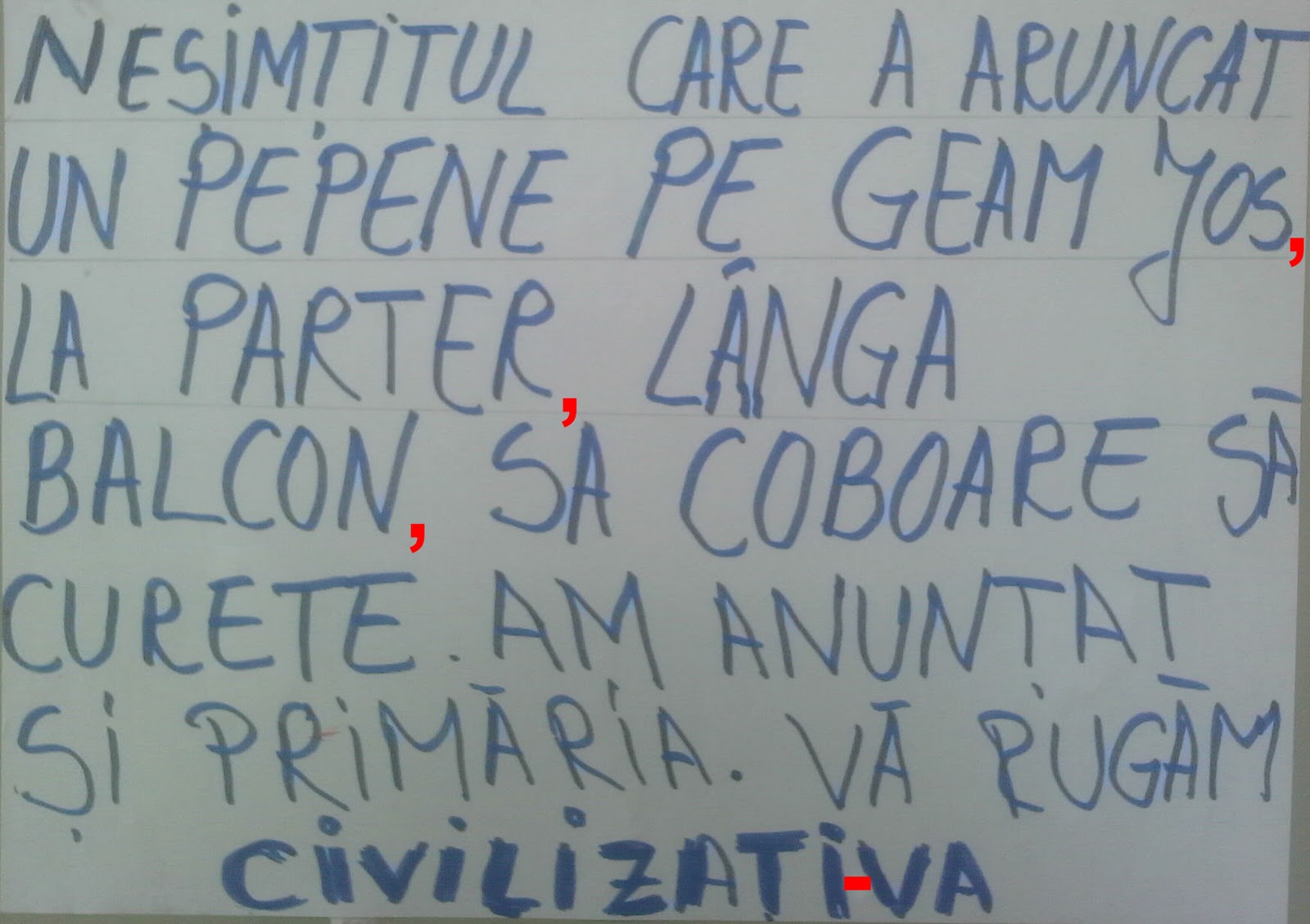Pe principiu la ce îmi trebuie mie româna dacă trăiesc în România, vă voi expune o poză care vă va încanta văzul, auzul(dacă vă va citi cineva sau veți citi cu voce tare) și toate celelalte simțuri, chiar și gustul. Sigur gustul va fi unul amar, deoarece o persoană spune că e prietenă cu bunul simț, educația etc., dar este foarte certat cu gramatica limbii romane. Bineînțeles că nu contest faptul că persoana care a făcut urâtul gest de a arunca un pepene de la balcon, gândindu-se probabil că e biodegradabil, este lipsit de respec pentru tot ce înseamna rasa umană și chiar animală, dar asta nu scuză persoana de câteva ore de gramaticâ. De acee am două recomandări, câte una pentru fiecare persoană și anume: